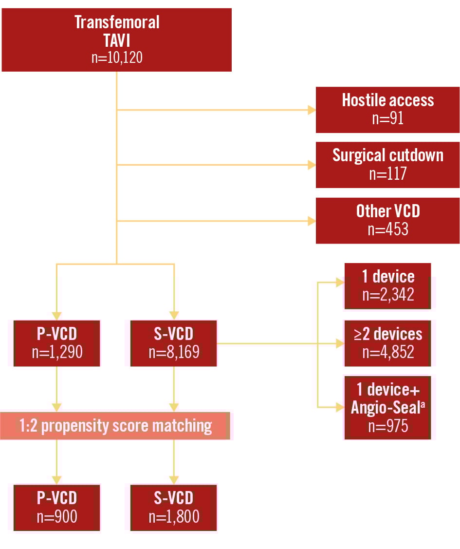 Figure 1. Study flowchart. Overall, 10,120 patients with transfemoral TAVI were evaluated in the PULSE registry. After exclusion of patients with hostile access (peripheral transluminal angioplasty or stent implantation to gain transfemoral access), planned surgical cutdown, or the use of other vascular closure devices, 1:2 propensity score matching was performed. aBy Terumo. PULSE: Plug or sUture based vascuLar cloSurE after TAVI; P-VCD: plug-based vascular closure device; S-VCD: suture-based vascular closure device; VCD: vascular closure device; TAVI: transcatheter aortic valve implantation