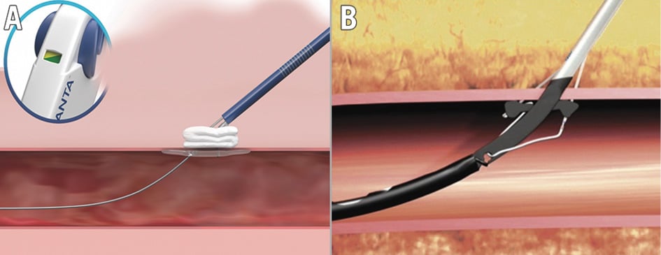 Figure 2. Plug- and suture-based vascular closure. Plug-based vascular closure device (A; MANTA [Teleflex]) and suture-based vascular closure device (B; ProGlide [Abbott]) strategies were evaluated. Reproduced with permission from Teleflex Medical GmbH, Fellbach, Germany (A), and Abbott Vascular International BVBA, Diegem, Belgium (B).