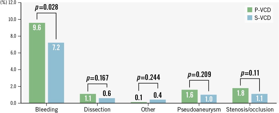 Large-bore access-related complications for P-VCD versus S-VCD occurred in 14.9% versus 10.3% (p<0.001), respectively, and were considered major in 3.6% versus 4.6% (p=0.218) and minor in 11.3% versus 5.8% (p<0.001) of patients (Central illustration). Bleeding accounted for most of these complications (9.6% vs 7.2%; p=0.028), followed by stenosis/occlusion (1.8% vs 1.1%; p=0.11), pseudoaneurysm (1.6% vs 1.0%; p=0.209), dissection (1.1% vs 0.6%; p=0.167) and other (0.1% vs 0.4%; p=0.244) (Figure 3).