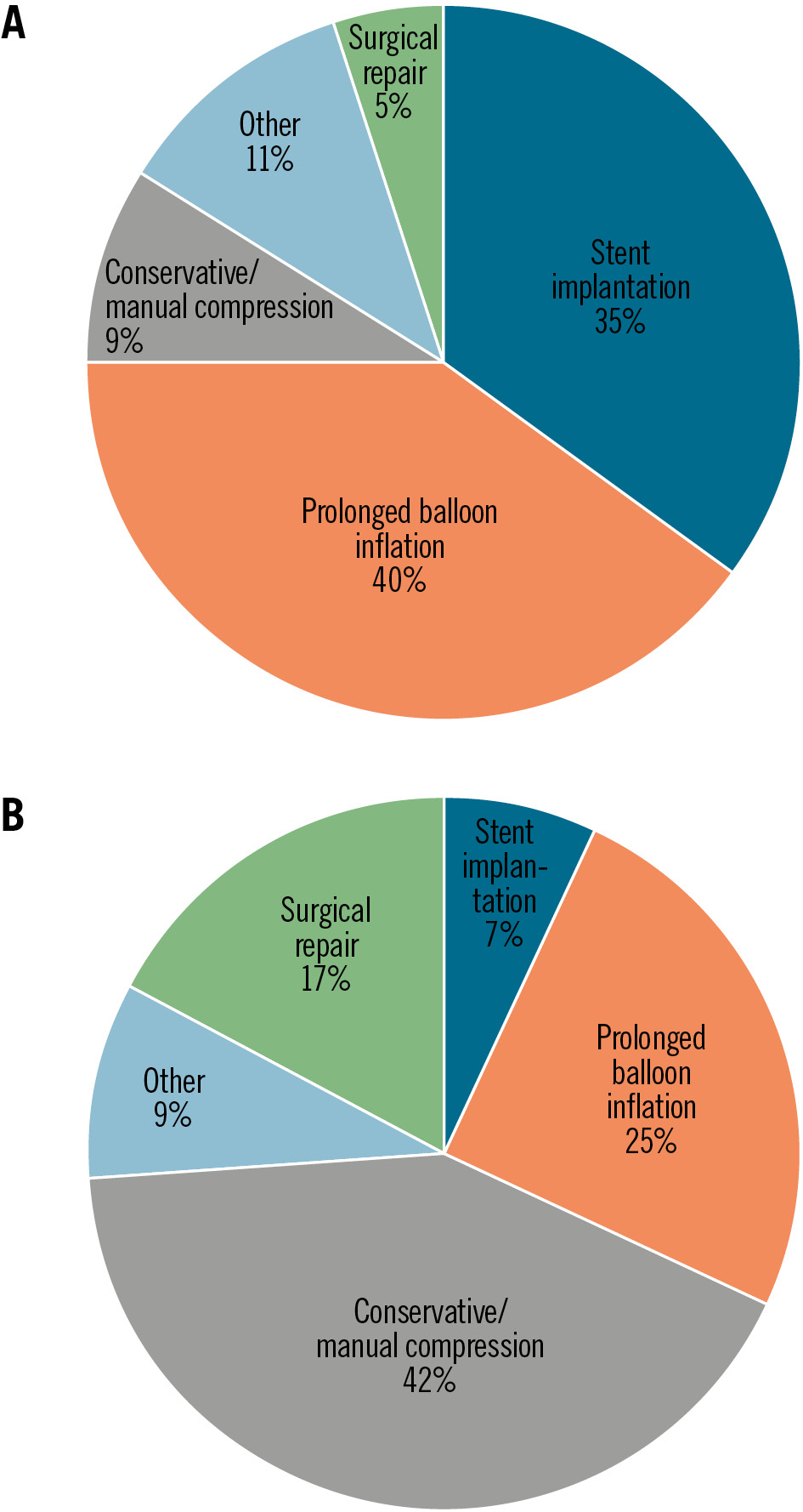 Figure 4. Treatment of access-related vascular complications at the primary TAVI access site. P-VCD (A) and S-VCD (B) groups. P-VCD: plug-based vascular closure device; S-VCD: suture-based vascular closure device; TAVI: transcatheter aortic valve implantation