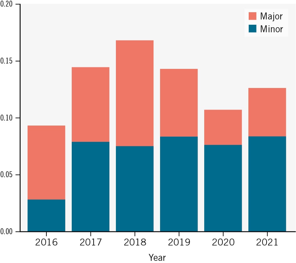 Figure 5. Temporal trend of vascular complications in the PULSE registry. A significant reduction of major access-related vascular complications at the primary TAVI access was observed in the unmatched PULSE registry from 2016 to 2021 (p<0.001 according to the Cochran-Armitage test with Bonferroni-corrected p-value). PULSE: Plug or sUture based vascuLar cloSurE after TAVI; TAVI: transcatheter aortic valve implantation