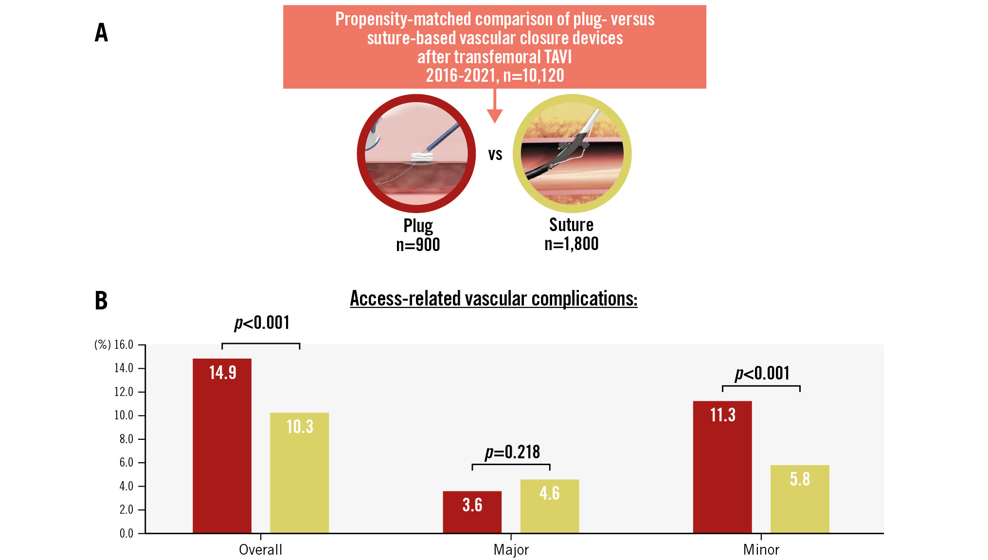 Central illustration. Access-related vascular complications at the primary access site. A) From an initial cohort of 10,120 patients, propensity matching resulted in 900 patients with P-VCD and 1,800 with S-VCD. B) Study results for access-related vascular complications at the primary access site. Reproduced with permission from Teleflex Medical GmbH, Fellbach, Germany (A) and Abbott Vascular International BVBA, Diegem, Belgium. (B). P-VCD: plug-based vascular closure device; S-VCD: suture-based vascular closure device: TAVI: transcatheter aortic valve implantation