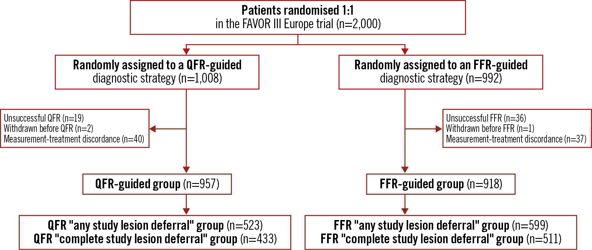 Figure 1. Patient flowchart. A total of 2,000 patients were enrolled in the FAVOR III Europe trial and randomised 1:1 to a QFR-guided strategy or an FFR-guided strategy. The “any study lesion deferral” group comprises patients with deferral of at least one study lesion based on QFR or FFR. The “complete study lesion deferral” group comprises patients with deferral of all study lesions based on QFR or FFR. FFR: fractional flow reserve; QFR: quantitative flow ratio