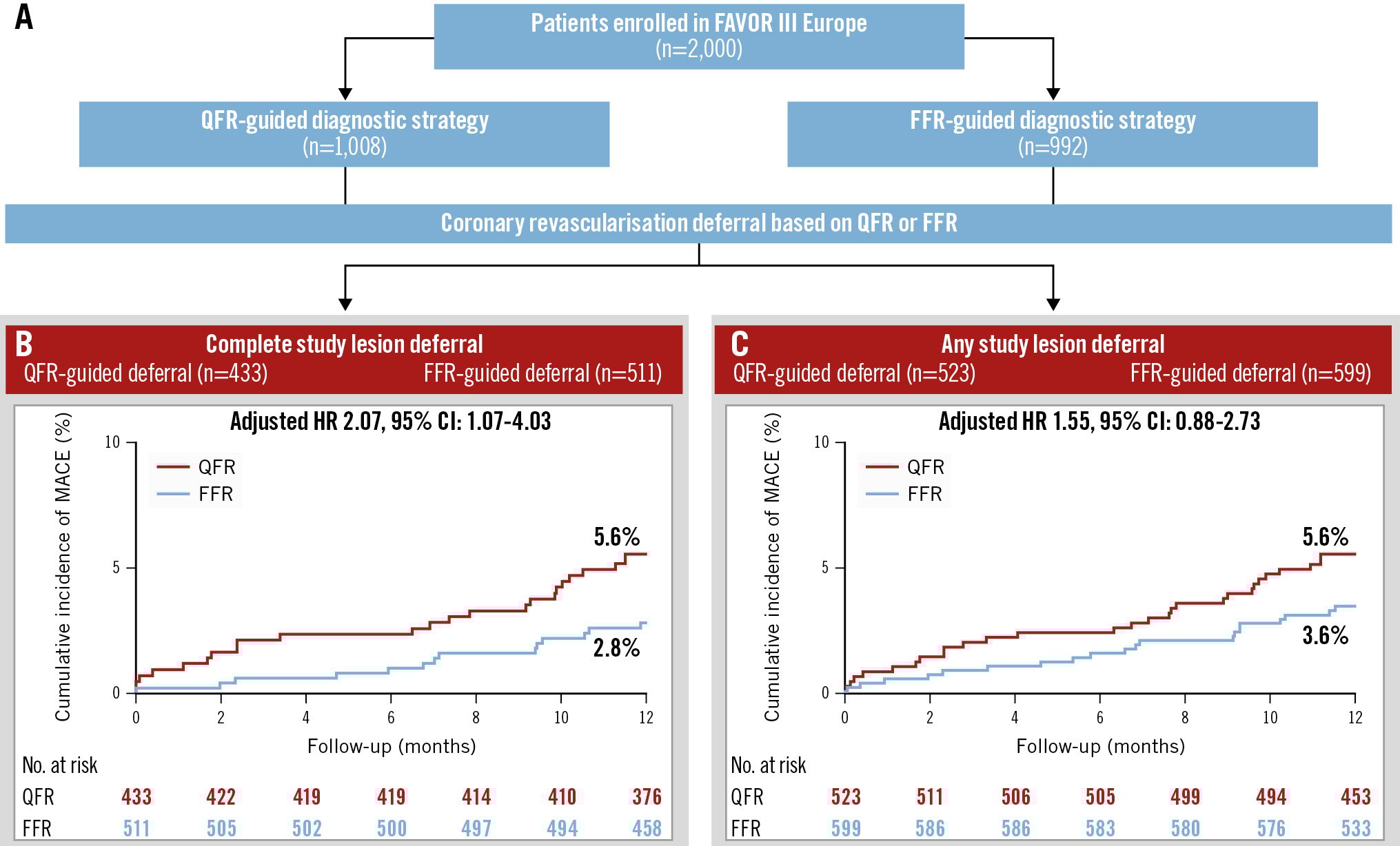 In the “complete study lesion deferral” group, MACE occurred in 24 patients (5.6%) in the QFR group and in 14 patients (2.8%) in the FFR group (adjusted HR 2.07, 95% CI: 1.07-4.03; p=0.03) at 1 year.