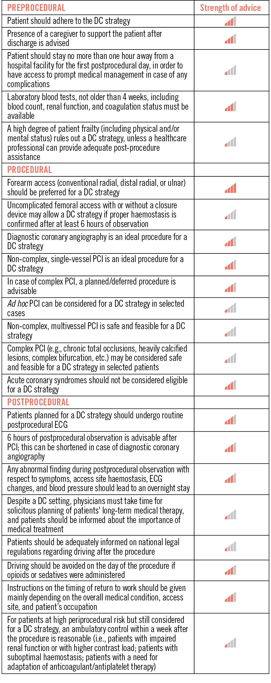 Postprocedural observation is a key element for a safe DC strategy. Following the procedure, clinical PCI success should be assessed utilising standard definitions, and any adverse event should be recorded. If the success criteria are not met, monitoring should be extended with overnight admission.