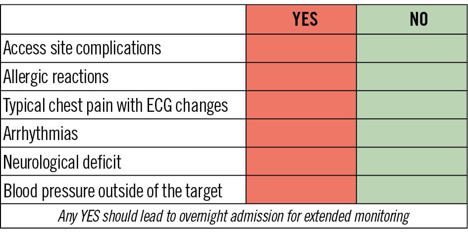 The usual hospital stay time for a DC varies, but a 6-hour observation time seems to be reasonable, considering that most periprocedural complications occur within 6 hours after PCI3334. The observation time may be decreased to 2-4 hours in case of pure diagnostic procedures, depending on the haemostasis policy. During that time, periodic observation, preferentially in the form of a checklist, for potential adverse events should be made. This includes checking for access site complications, for allergic reactions, for typical chest pain, for signs and symptoms of neurological deficit, for blood pressure beyond acceptable thresholds (systolic: 100-150 mmHg, diastolic: 70-90 mmHg), as well as for ECG changes and arrhythmias. Any abnormal finding in these respects should indicate overnight monitoring and potentially provisional next-day discharge. Validation of discharge should be made always by a well-informed healthcare professional (interventional cardiologist/clinical cardiologist/trained nurse) (Figure 2).