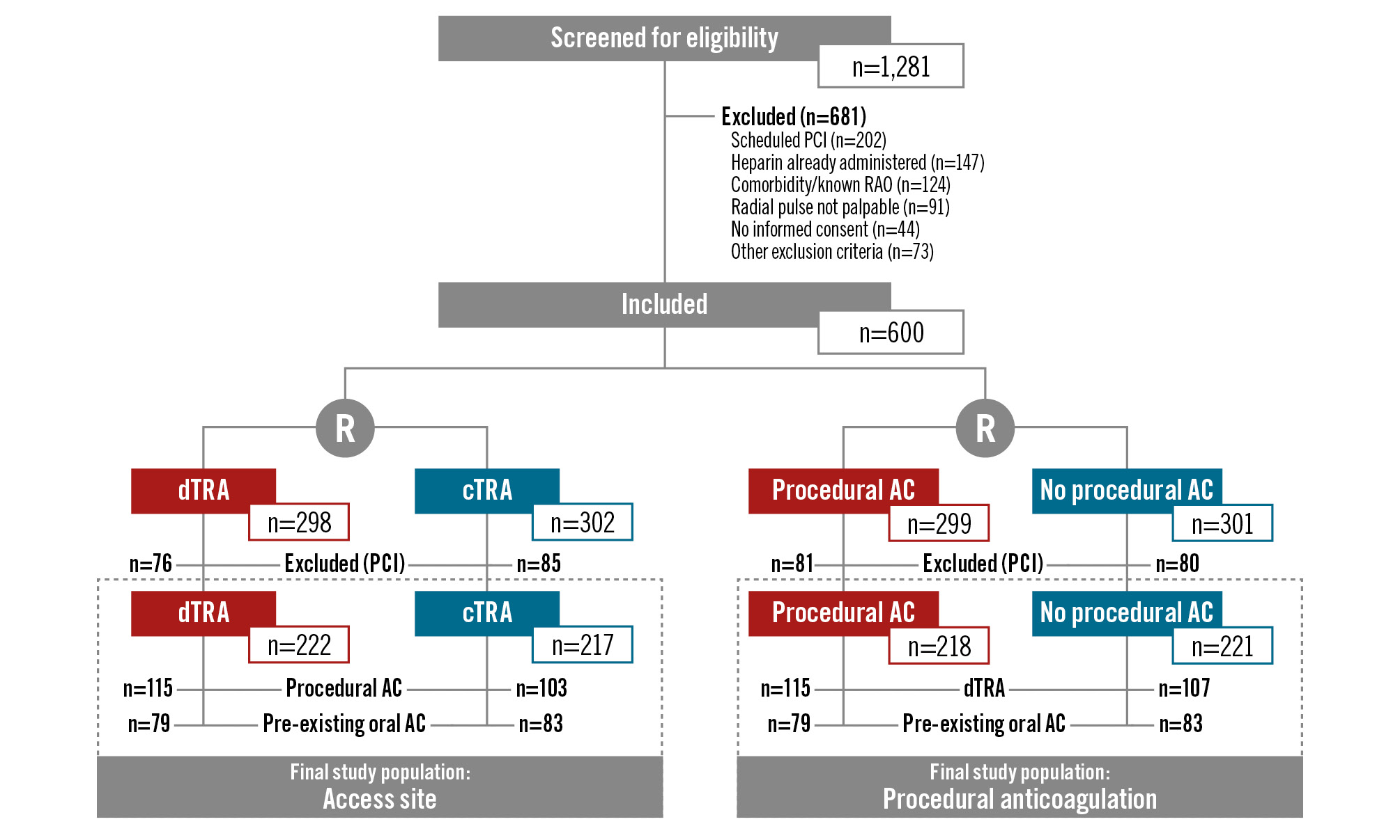 Figure 1. Study flowchart. AC: anticoagulation; cTRA: conventional transradial access; dTRA: distal transradial access; PCI: percutaneous coronary intervention; R: randomisation; RAO: radial artery occlusion