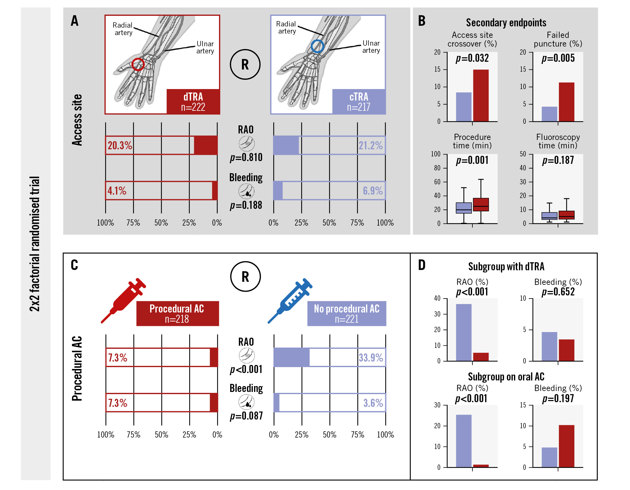 Central illustration. The RAPID trial: 2x2 factorial randomised trial. A) Comparison of dTRA with cTRA showed similar rates of RAO and bleeding events in both study groups. B) The frequency of failed puncture attempts and access site crossover were significantly increased in the dTRA group, resulting in an overall prolonged duration of the procedure without increasing fluoroscopy time. C) Procedural AC was associated with a substantially reduced risk of RAO, while rates of bleeding events were not significantly increased. These findings were consistent in all subgroups including patients on oral AC and with dTRA (D). AC: anticoagulation; cTRA: conventional transradial access; dTRA: distal transradial access; R: randomisation; RAO: radial artery occlusion