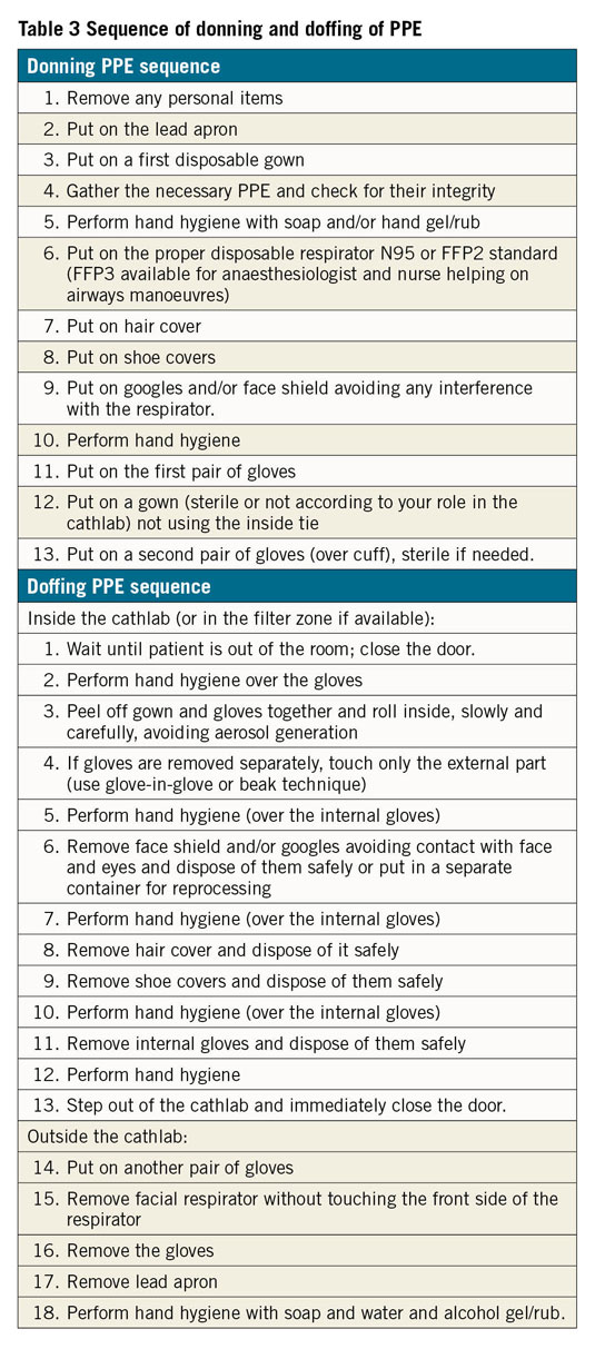 All HCWs have to be routinely trained in the correct and appropriate use of PPE. Donning/doffing (the process of putting on and removing PPE) manoeuvres should be supervised by a trained observer who reads the correct sequence of PPE use to minimize the risk of contamination (Table 3).