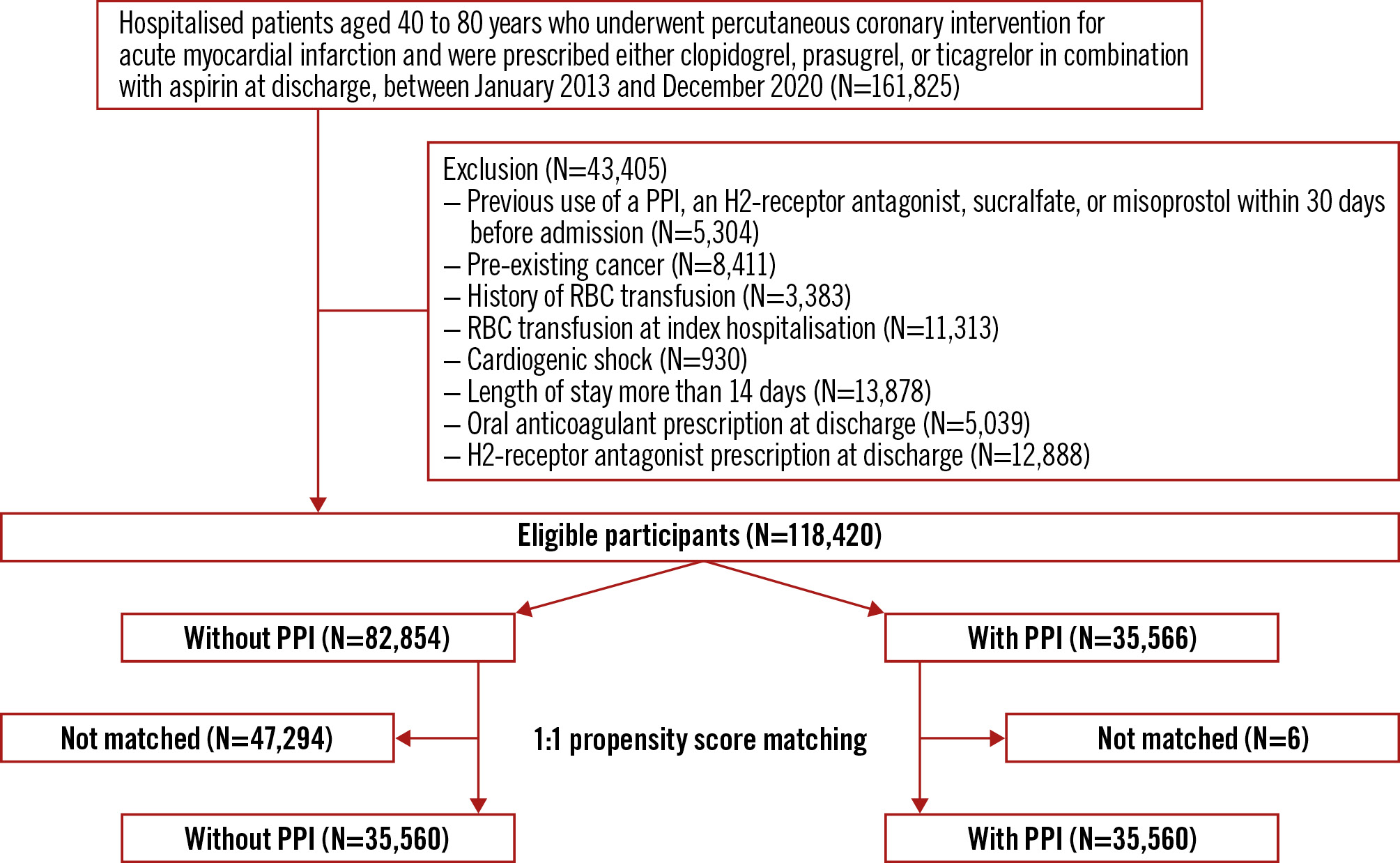 Methods: A search was conducted using a nationwide Korean claims database to identify patients with AMI undergoing PCI with DAPT. Patients were matched using a large-scale propensity score (PS) algorithm according to the co-prescription of PPIs. The primary efficacy endpoint was major gastrointestinal bleeding requiring transfusion with hospitalisation within 1 year. The primary safety endpoint was major adverse cardiac and cerebrovascular events (MACCE), a composite of cardiovascular death, spontaneous myocardial infarction, repeat revascularisation and ischaemic stroke within 1 year.