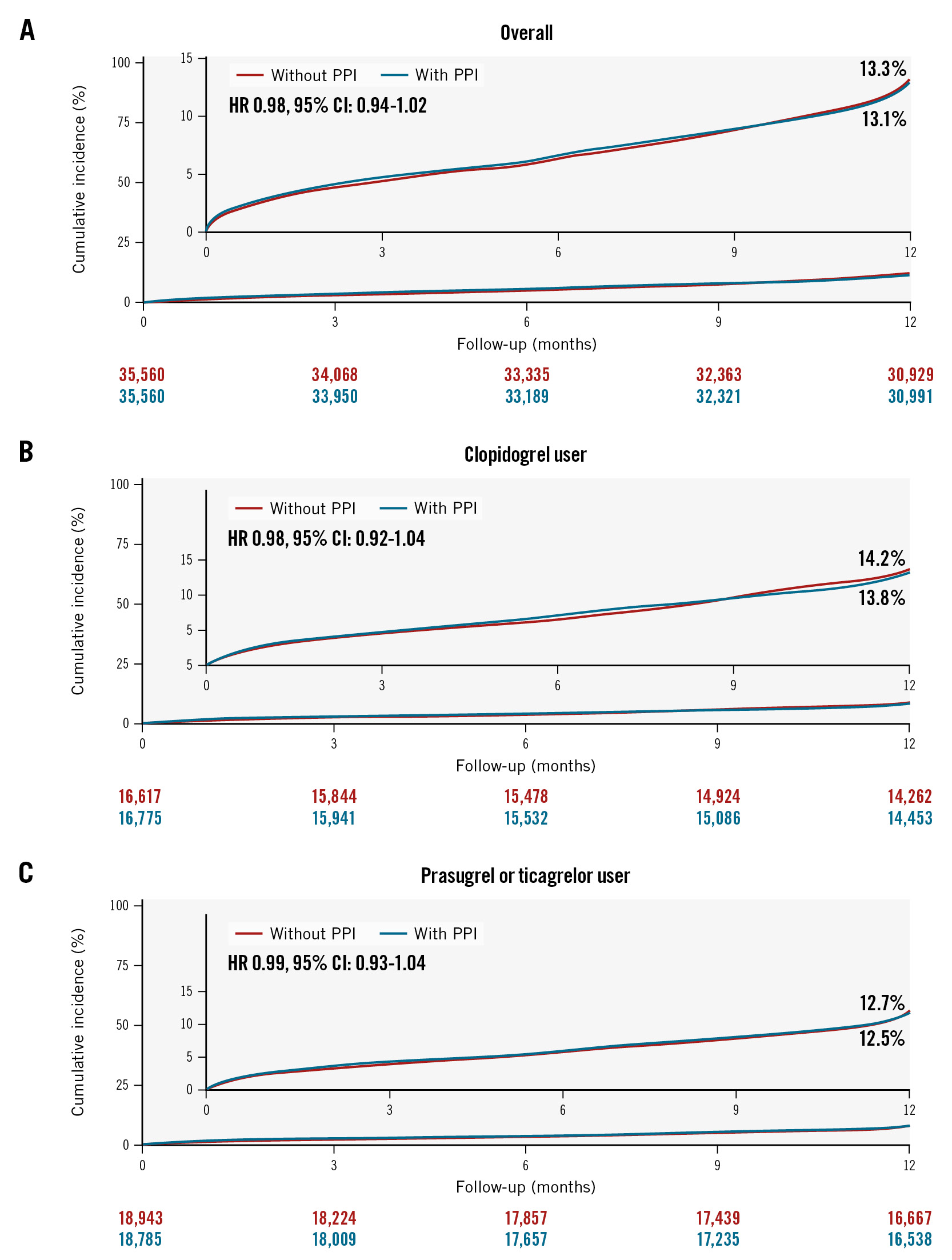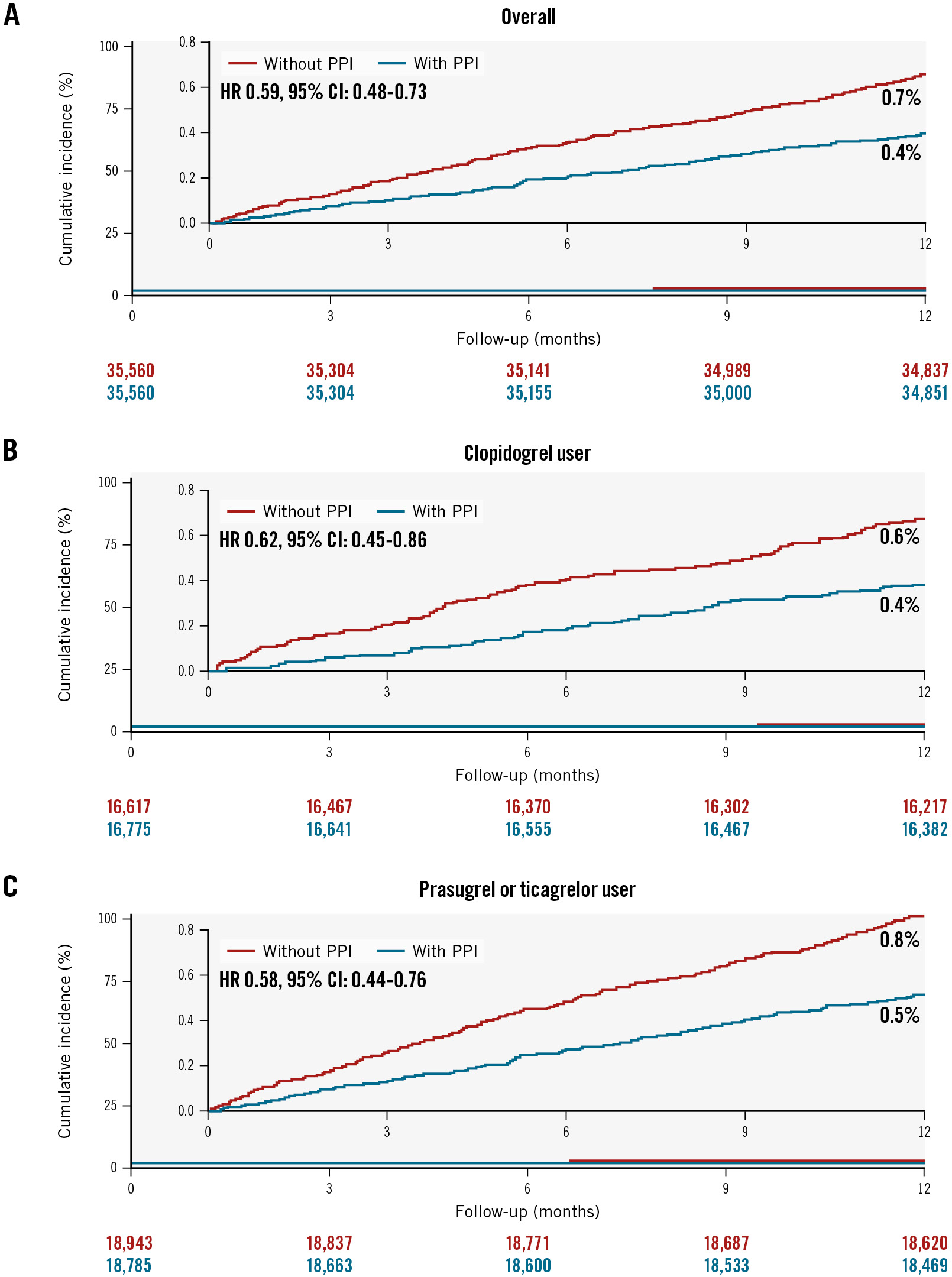 Figure 3. Cumulative incidence of major adverse cardiac and cerebrovascular events up to 1-year follow-up. Kaplan-Meier curves are shown to compare major adverse cardiac and cerebrovascular events (a composite of cardiovascular death, spontaneous MI, repeat revascularisation, and ischaemic stroke) according to the use of PPIs in patients overall (A), in clopidogrel users (B), and in potent P2Y12 inhibitor users (C) with AMI undergoing PCI on DAPT. AMI: acute myocardial infarction; CI: confidence interval; DAPT: dual antiplatelet therapy; GI: gastrointestinal; HR: hazard ratio; PCI: percutaneous coronary intervention; PPI: proton pump inhibitor
