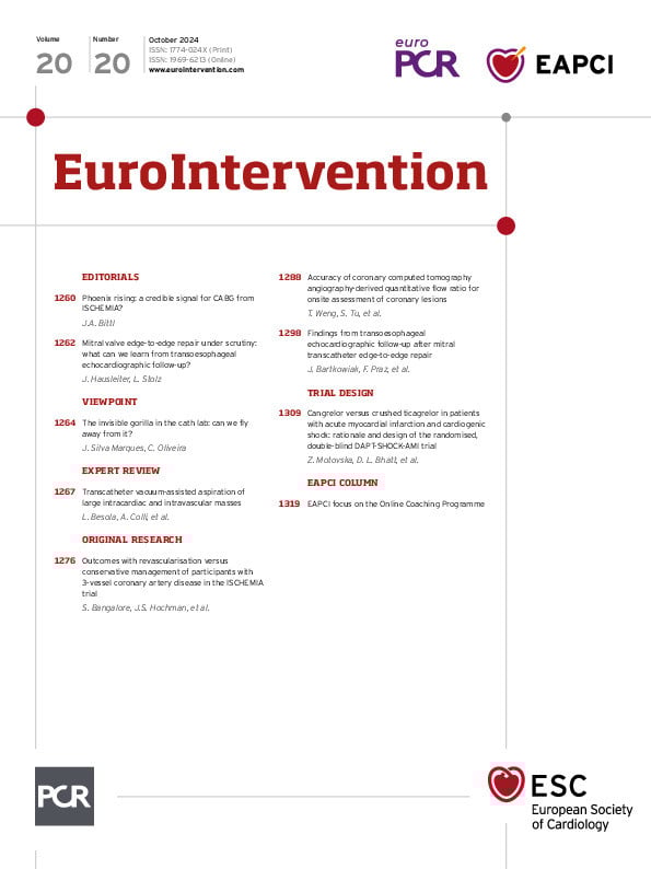 J. Bartkowiak reports a research grant from Novartis Foundation. M. Kassar reports a research grant from Swiss Heart Foundation. D. Samim reports institutional grants from Edwards Lifesciences. S. Windecker reports research, travel or educational grants to the institution from Abbott, Abiomed, Amgen, AstraZeneca, Bayer, B. Braun, Biotronik, Boehringer Ingelheim, Boston Scientific, Bristol-Myers Squibb, Cardinal Health, Cardiovalve (now Venus Medtech), Cordis Medical, CorFlow Therapeutics, CSL Behring, Daiichi Sankyo, Edwards Lifesciences, Farapulse Inc., Fumedica, Guerbet, Idorsia, Inari Medical, Infraredx, Janssen-Cilag, Johnson & Johnson, MedAlliance, Medicure, Medtronic, Merck Sharp & Dohme, Miracor Medical, Novartis, Novo Nordisk, Organon, OrPha Swiss, Pharming Technologies B.V., Pfizer, Polares, Regeneron, Sanofi-Aventis, Servier, Sinomed, Terumo, Vifor, and V-Wave; and served as advisory board member and/or member of the steering/executive group of trials funded by Abbott, Abiomed, Amgen, AstraZeneca, Bayer, Boston Scientific, Biotronik, Bristol-Myers Squibb, Edwards Lifesciences, MedAlliance, Medtronic, Novartis, Polares, Recardio, Sinomed, Terumo, and V-Wave with payments to the institution but no personal payments; he is also a member of the steering/executive committee group of several investigator-initiated trials that receive funding from industry without impact on his personal remuneration; he is Vice-President of the ESC and Associate Editor of JACC CV Interventions. T. Pilgrim reports research, travel, and educational grants to the institution from Boston Scientific, Biotronik, Medtronic, and Edwards Lifesciences; and speaker fees from Biotronik, Boston Scientific, Edwards Lifesciences, Abbott, and Medtronic; he is a member of clinical event adjudication committee for HighLife SAS DSMB for a study from Biosensors; and received equipment, materials, drugs, medical writing, gifts or other services from ATSens; he participates on a data safety monitoring board or advisory board for Biosensors (EMPIRE trial). F. Praz reports compensation for travel expenses from Abbott, Edwards Lifesciences, Medira, Siemens Healthineers, and InQB8 Medical Technologies; as well as a research grant to the institution from Abbott. The other authors have no conflicts of interest to declare.