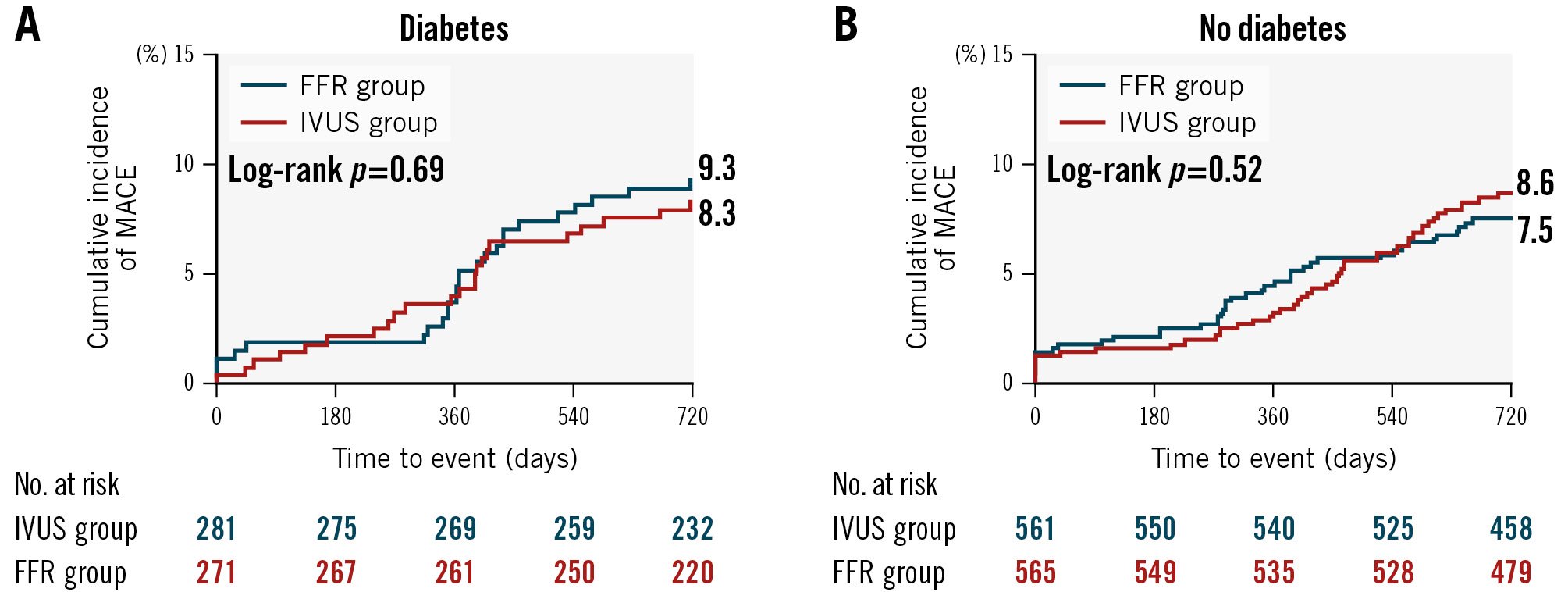 Figure 1. Cumulative incidence of MACE at 24 months between the FFR and IVUS groups according to the presence of diabetes. A) Diabetic patients and (B) non-diabetic patients. FFR: fractional flow reserve; IVUS: intravascular ultrasound; MACE: major adverse cardiac events