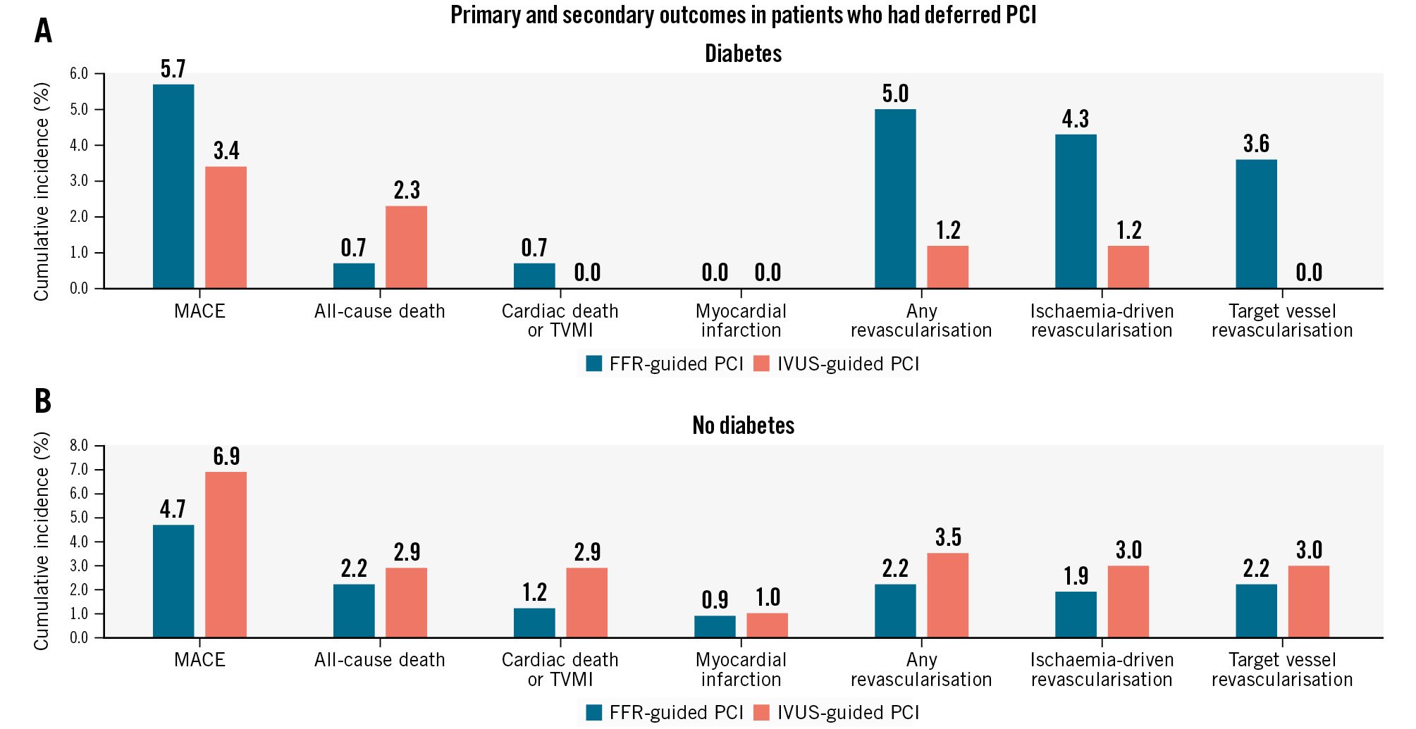 Figure 2. Occurrence rate of the primary and secondary outcomes in patients who had deferred PCI with medical treatment according to the presence of diabetes. A) Diabetic patients and (B) non-diabetic patients. FFR: fractional flow reserve; IVUS: intravascular ultrasound; MACE: major adverse cardiac events; TVMI: target vessel myocardial infarction