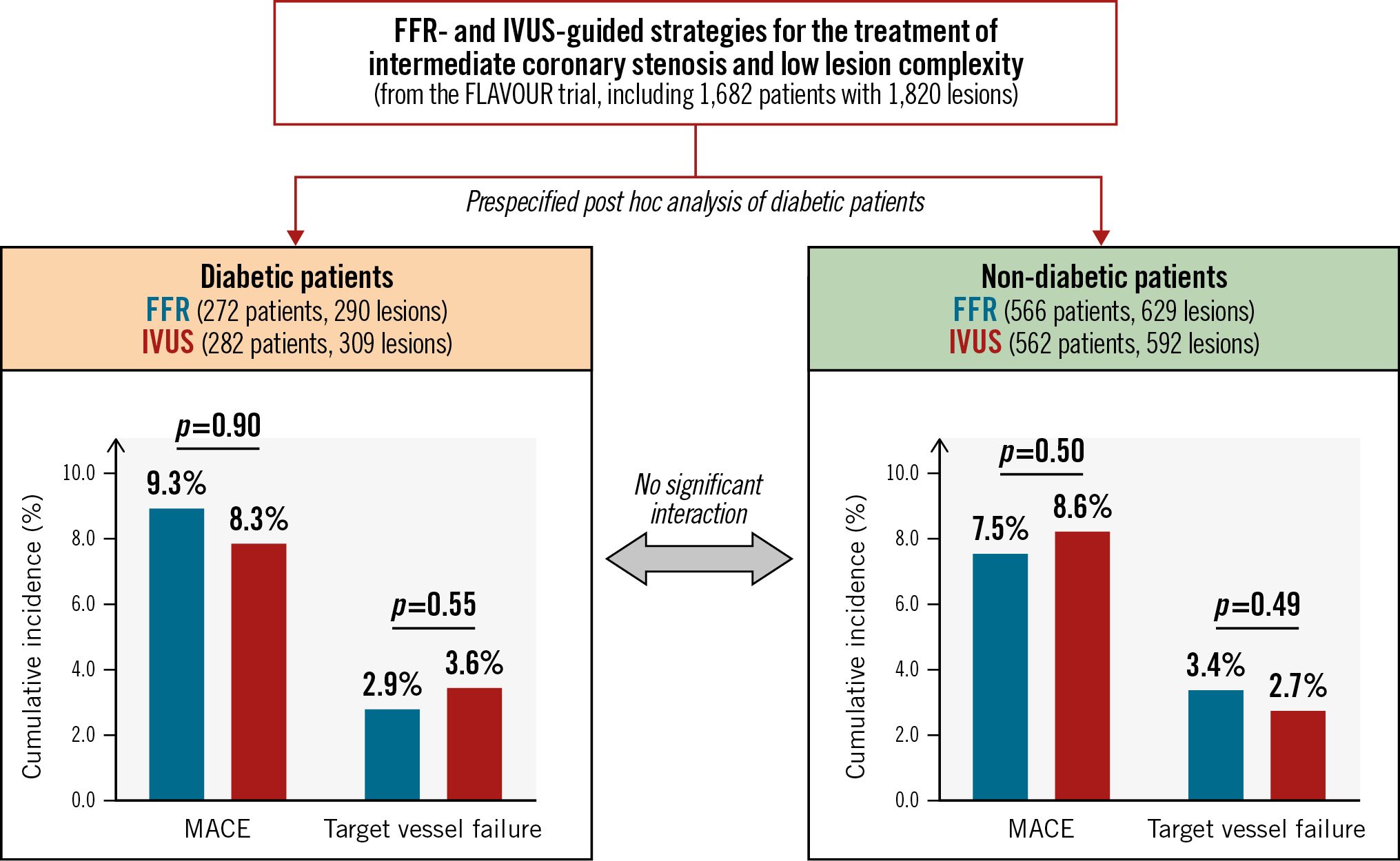 This prespecified substudy from the FLAVOUR trial assessed the outcomes of lesion selection for PCI guided by FFR versus IVUS according to the presence of diabetes (Central illustration). The main findings of our study were as follows: (1) there were no significant differences in MACE or TVF between the FFR and IVUS group in either diabetic or non-diabetic patients. 2) The IVUS group had more frequent stent implantation and administration of antiplatelet agents than the FFR group regardless of the presence of diabetes. 3) In the subgroup analysis in patients who received medical treatment only or PCI, there were no significant differences in MACE or TVF between the two groups in either diabetic or non-diabetic patients. Among non-diabetic patients who underwent PCI, the TVR rate was higher in the FFR group compared with the IVUS group, with a marginal interaction.