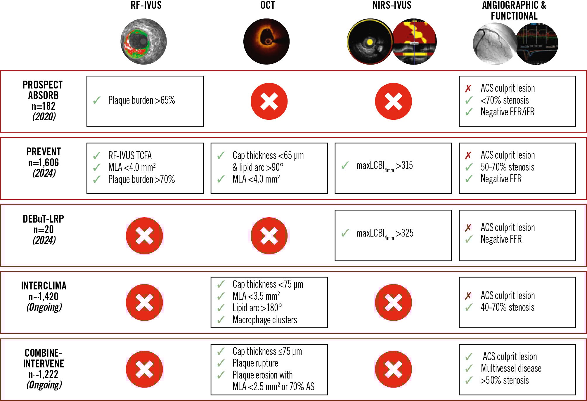 | *RF-IVUS defined TCFA: ≥10% confluent necrotic core with >30° abutting the lumen in three consecutive frames. #OCT defined TCFA: a lipid plaque with arc >90° and fibrous cap thickness <65 μm. ACS: acute coronary syndrome; BVS: bioabsorbable vascular scaffold; CCS: chronic coronary syndrome; DCB: drug-coated balloon; DES: drug-eluting stent; EEM: external elastic membrane; FFR: fractional flow reserve; hs-CRP: high-sensitivity C-reactive protein; IC: intracoronary; iFR: instantaneous wave-free ratio; IQR: interquartile range; IVUS: intravascular ultrasound; maxLCBI4mm: maximal lipid core burden indexed in a 4 mm segment; MI: myocardial infarction; MLA: minimum lumen area; NIRS: near-infrared spectroscopy; NSTE-ACS: non-ST-segment elevation acute coronary syndrome; OCT: optical coherence tomography; OMT: optimal medical therapy; PCI: percutaneous coronary intervention; RF: radiofrequency; SAQ: Seattle Angina Questionnaire; STEMI: ST-segment elevation myocardial infarction; TCFA: thin-cap fibroatheroma; TIA: transient ischaemic attack; TIMI: Thrombolysis in Myocardial Infarction; TLR: target lesion revascularisation; TVR: target vessel revascularisation | |||||