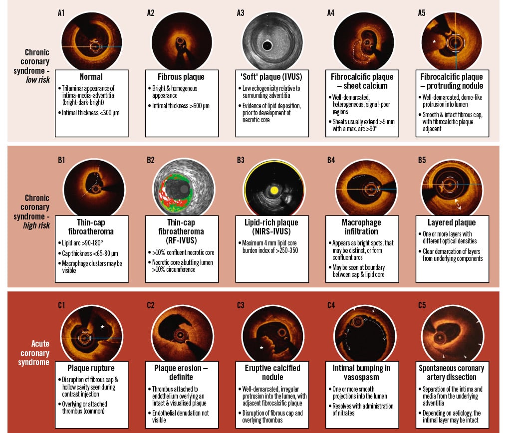 IC imaging technologies have supported an evolution in our understanding of coronary atherosclerosis that may be reliably applied to inform lesion stratification and guide clinical care. Histological study established that a thin-cap fibroatheroma (TCFA), with evidence of cholesterol crystal deposition, a large necrotic core, neovascularisation, and immune cell infiltration, represents the highest clinical risk lesion and is commonly referred to as a “vulnerable” plaque424.