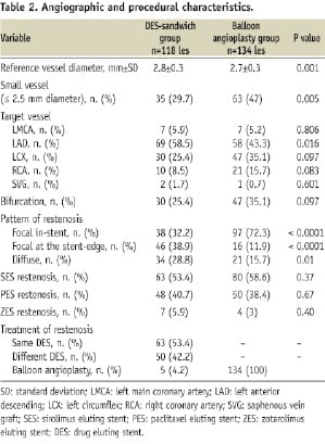 In both groups there was a high prevalence of diabetics (39.4% and 40.3% in DES-sandwich and in BA group, respectively; P=0.88), underscoring theintrinsic high risk profile of thispatients subset. Among the overall population, 64.3% of the patients (58.5% in DES-sandwich group and 68.9% in BA group; P=0.15) presented with a stable clinical status (asymptomatic, silent ischaemia or stable angina). Asymptomatic patients represented 5.6% of the overall population (5.3% in DES-sandwich group and 5.0% in BA group; P=0.82). In 65.7% of patients presenting with acute coronary syndrome (ACS), without any significant differences between the two groups, DES restenosis was indentified as the culprit lesion. Because of the selection criteria, none of the BA group patients received repeat DES implantation; conversely, 4.2% of the DES-sandwich group patients had a DES-restenosis treated with balloon angioplasty alone (besides the DES-sandwich lesion). We analysed 252 DES restenotic lesions: 118 lesions in the DES-sandwich group and 134 lesions in the BA group. Among all of the study lesions, the initial DES implanted was a Cypher™ (Cordis, Johnson & Johnson, Warren, NJ, USA) sirolimus-eluting stent (SES) in 143 lesions (56.7%), a Taxus™ (Boston Scientific, Natick, MA, USA) paclitaxel-eluting stent (PES) in 98 lesions (38.9%) and an Endeavor™ (Medtronic, Minneapolis, MN, USA) zotarolimus-eluting stent (ZES) in 11 lesions (4.4%). The pattern of restenosis was focal in 197 lesions (78.2%) and diffuse in 55 lesions (21.8%). We did not find any significant association between DES type and pattern of restenosis. The DES-sandwich group patients had a lower prevalence of small treated vessel (≤ 2.5 mm diameter) (29.7% vs. 47%, P=0.005) and a higher prevalence of LAD treatment (58.5% vs. 43.3%, P=0.016), compared with BA group patients. Moreover, the DES-sandwich group patients had a higher prevalence of diffuse and focal-edge restenosis pattern in comparison with the BA group patients (28.8% vs. 15.7%, P=0.01, and 38.9% vs. 11.9%, P<0.0001; respectively). Angiographic and procedural characteristics of the patients are presented in Table 2.