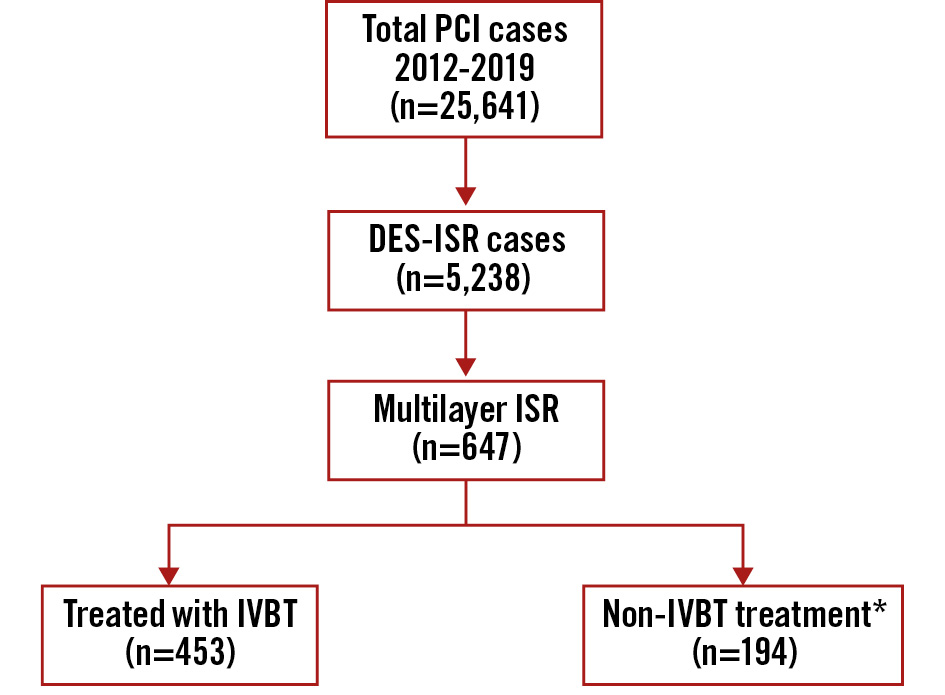 Figure 1. Graphical representation of the patients included in this analysis. *No drug-coated balloons used. DES: drug-eluting stent; ISR: in-stent restenosis; IVBT: intravascular brachytherapy; PCI: percutaneous coronary intervention
