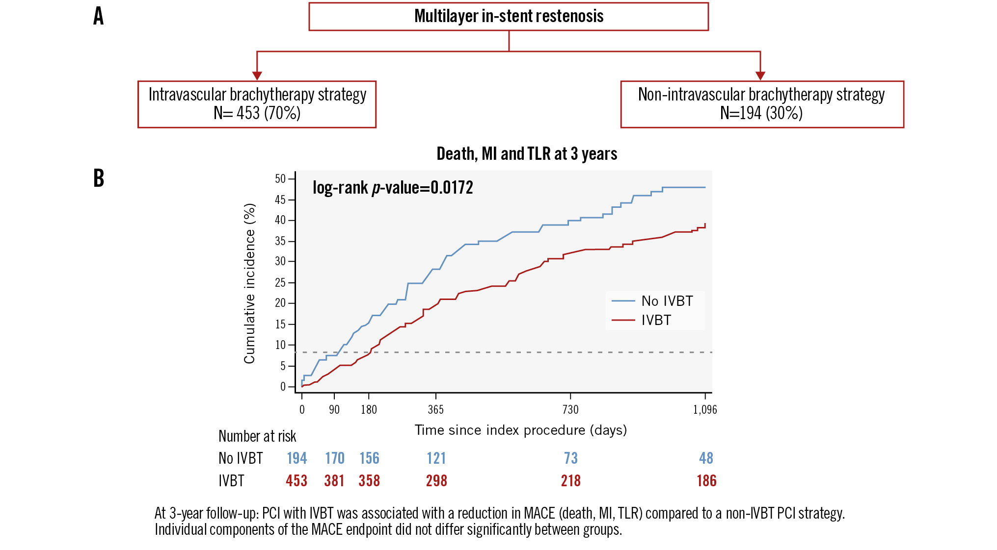 Central illustration. Clinical outcomes at 3 years after treatment of multilayer in-stent restenosis with an IVBT or a non-IVBT strategy. A) Patients treated for multilayer ISR (n=647) and PCI strategies; (B) Kaplan-Meier estimates for MACE at 3-year follow-up (IVBT vs non-IVBT strategy). IVBT: intravascular brachytherapy; MACE: major adverse cardiac events; MI: myocardial infarction; PCI: percutaneous coronary intervention; TLR: target lesion revascularisation