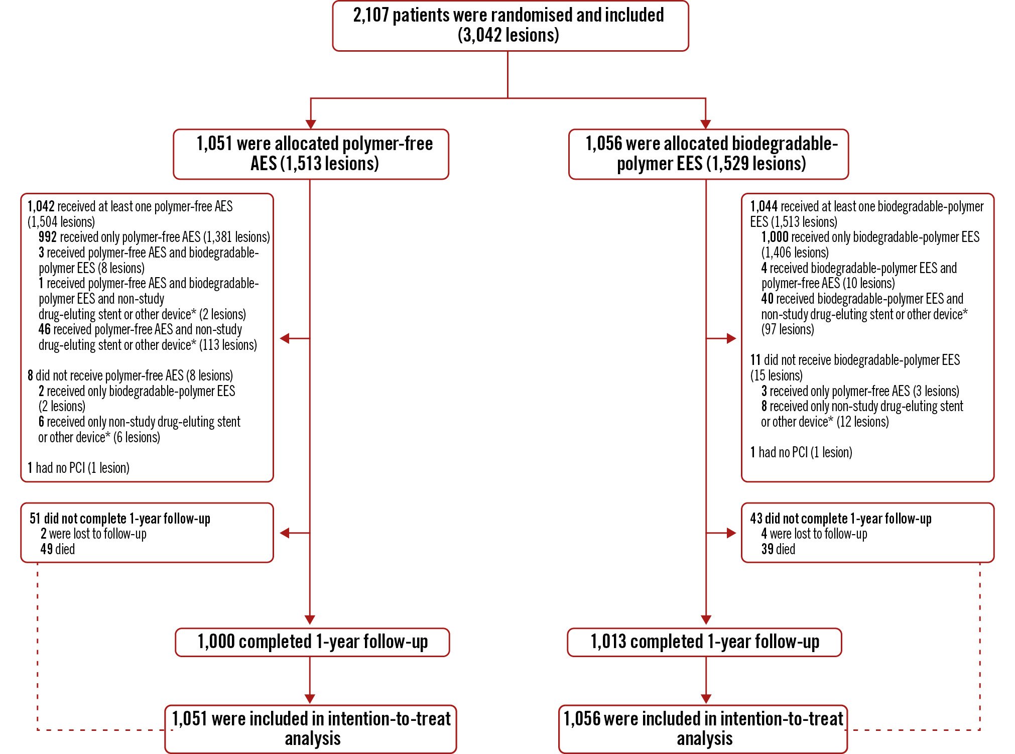 Results: Between January 2020 and June 2022, a total of 2,107 patients with 3,042 coronary lesions were randomised to polymer-free AES (1,051 patients) or biodegradable-polymer EES (1,056 patients). At 1-year follow-up, the primary endpoint occurred in 86 (8.2%) patients randomised to polymer-free AES and 76 (7.2%) patients randomised to biodegradable-polymer EES (risk difference 1%, upper limit of the 1-sided 95% confidence interval [CI] of 2.9%; p for non-inferiority=0.041). There were no significant differences in the incidence of the components of the primary endpoint between groups. However, definite or probable stent thrombosis occurred more frequently in patients randomised to polymer-free stents (1.0% vs 0.3%; hazard ratio 3.72, 95% CI: 1.04-13.33; p=0.044) due to an increased risk of early stent thrombosis within 30 day