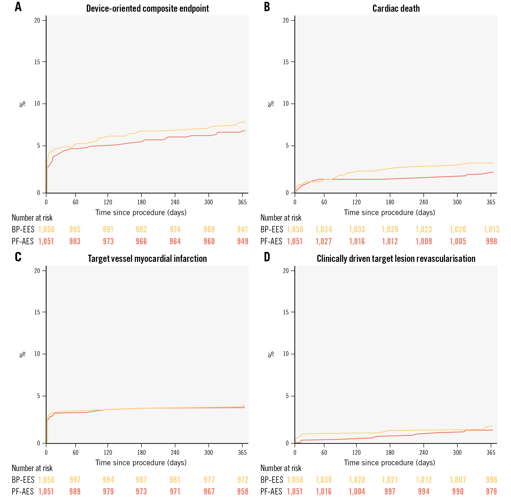 Figure 2. Kaplan-Meier curves at 1-year follow-up. Device-oriented composite endpoint (A), cardiac death (B), target vessel myocardial infarction (C), and clinically driven target lesion revascularisation (D). BP-EES: biodegradable-polymer everolimus-eluting stent (orange); PF-AES: polymer-free amphilimus-eluting stent (red).