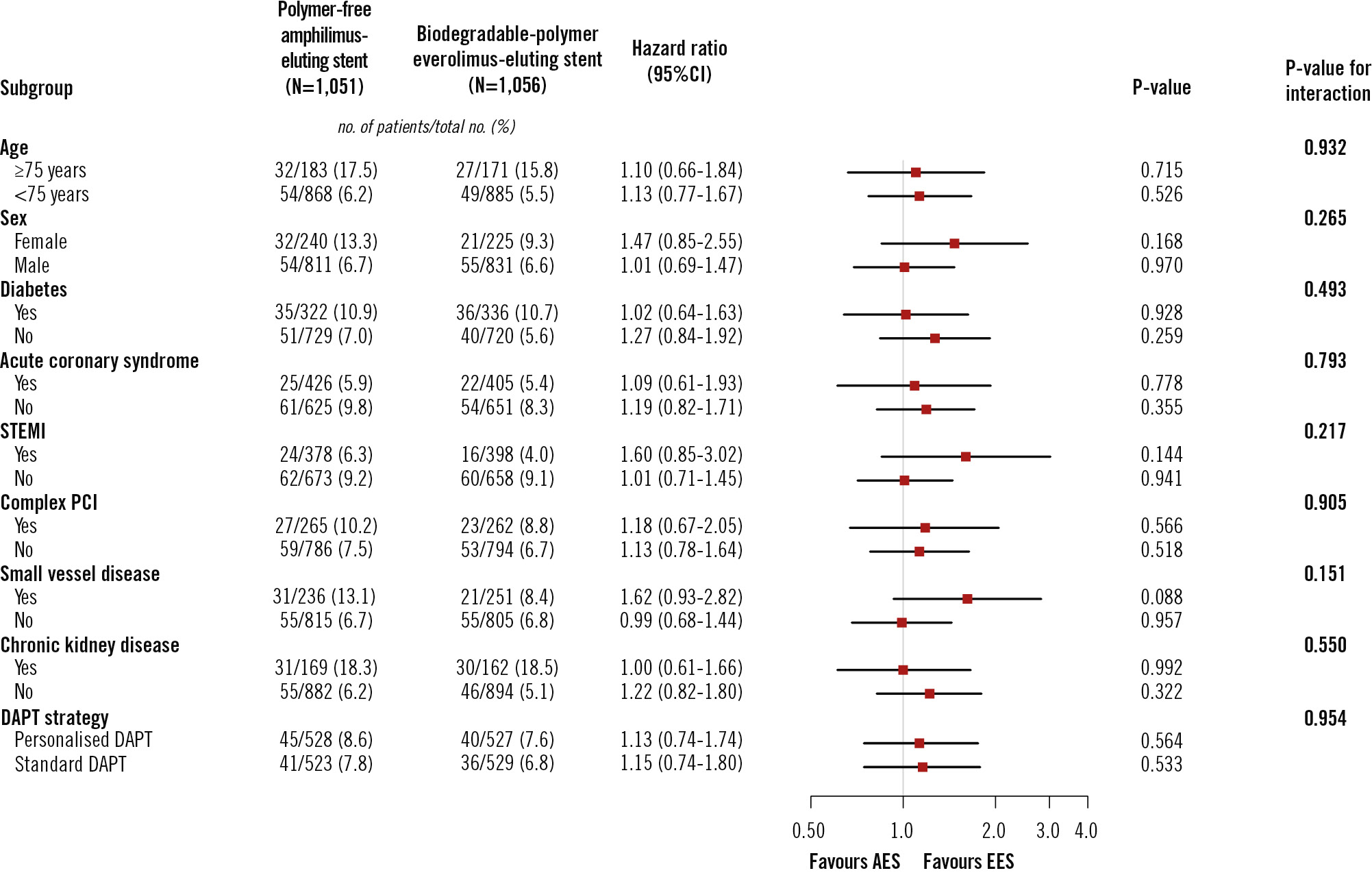 Figure 3. Subgroup analysis for the primary outcome in the intention-to-treat population. Chronic kidney disease was defined as kidney damage or glomerular filtration rate <60 mL/min/1.73 m2 for 3 months or more, irrespective of the cause. Complex PCI was defined as one of the following characteristics: ≥3 coronary vessels treated, ≥3 stents implanted, ≥3 lesions treated, bifurcation with 2 stents implanted, total stent length ≥60 mm, or treatment of chronic total occlusion. Small vessel disease was defined as the implantation of stent(s) <3 mm in diameter in the target lesion(s). AES: amphilimus-eluting stent; CI: confidence interval; DAPT: dual antiplatelet therapy; EES: everolimus-eluting stent; PCI: percutaneous coronary intervention; STEMI: ST-segment elevation myocardial infarction