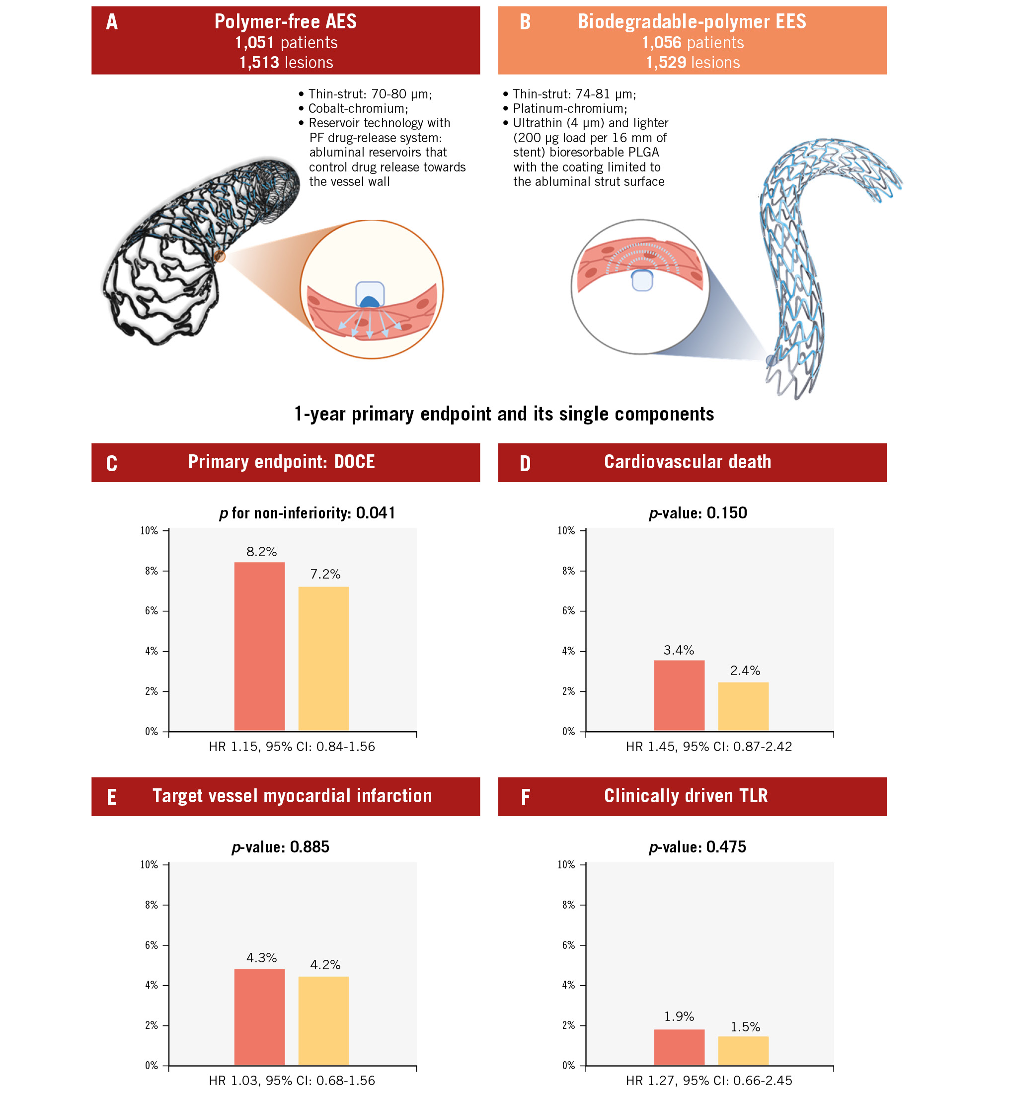 Central illustration. One-year results of the PARTHENOPE trial. Trial design with the main characteristics of the two study devices (A, B). The polymer-free AES (red) was non-inferior when compared to the biodegradable-polymer EES (orange). Non-inferiority testing for the primary endpoint (C) and superiority testing for the individual components of the primary endpoint (D, E, F) did not show significant differences between the polymer-free AES and the biodegradable-polymer EES. AES: amphilimus-eluting stent; CI: confidence interval; DOCE: device-oriented composite endpoint; EES: everolimus-eluting stent; HR: hazard ratio; PF: polymer-free; PLGA: poly lactic-co-glycolic acid; TLR: target lesion revascularisation