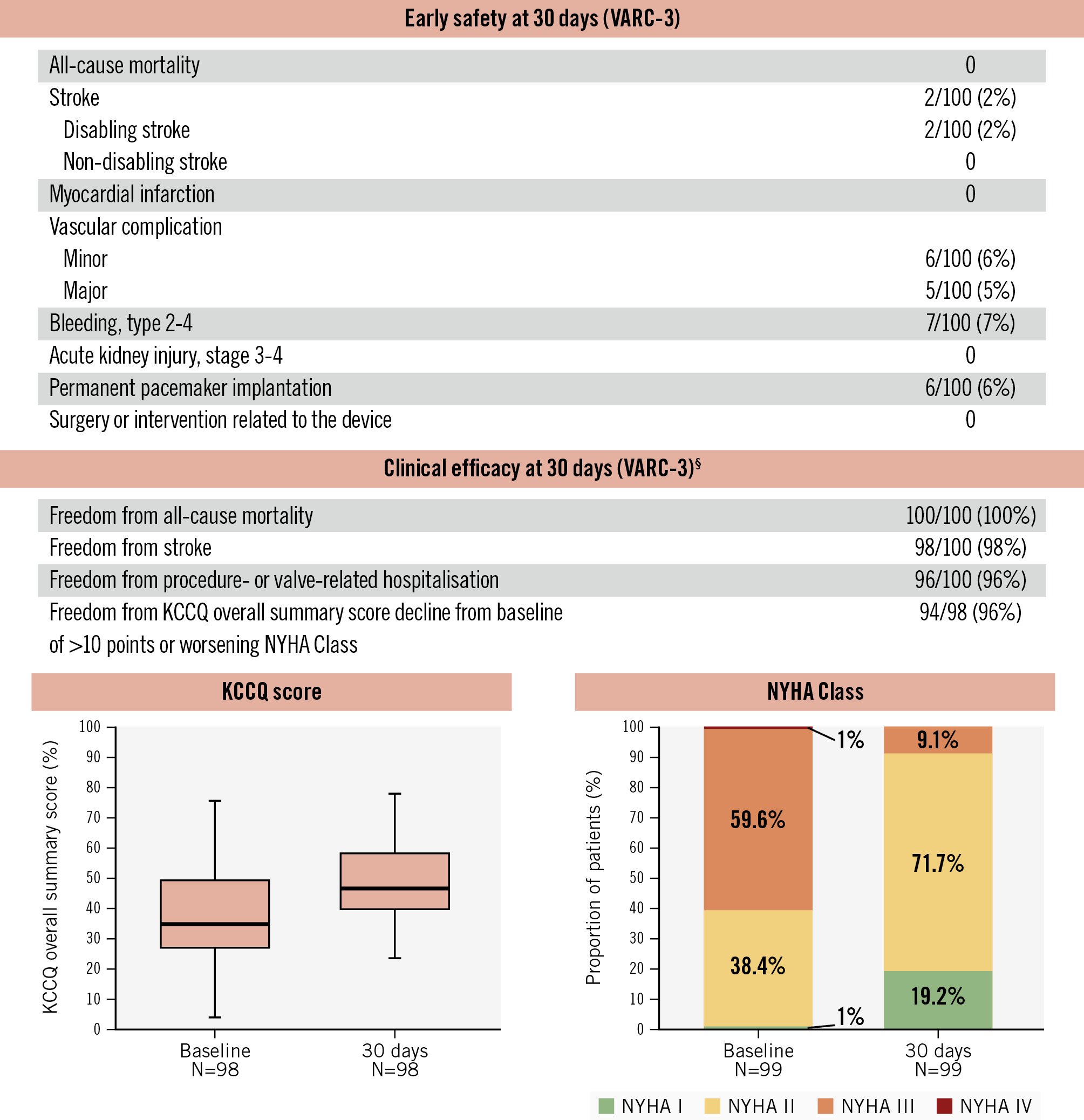 Figure 2. Thirty-day clinical outcomes. High clinical safety, clinical efficacy, and improvement in symptoms were observed at 30 days following DurAVR THV implantation in patients with small aortic annuli. Paired analysis for KCCQ and NYHA scores. §Modified VARC-3 definition. KCCQ: Kansas City Cardiomyopathy Questionnaire; NYHA: New York Heart Association; THV: transcatheter heart valve; VARC: Valve Academic Research Consortium