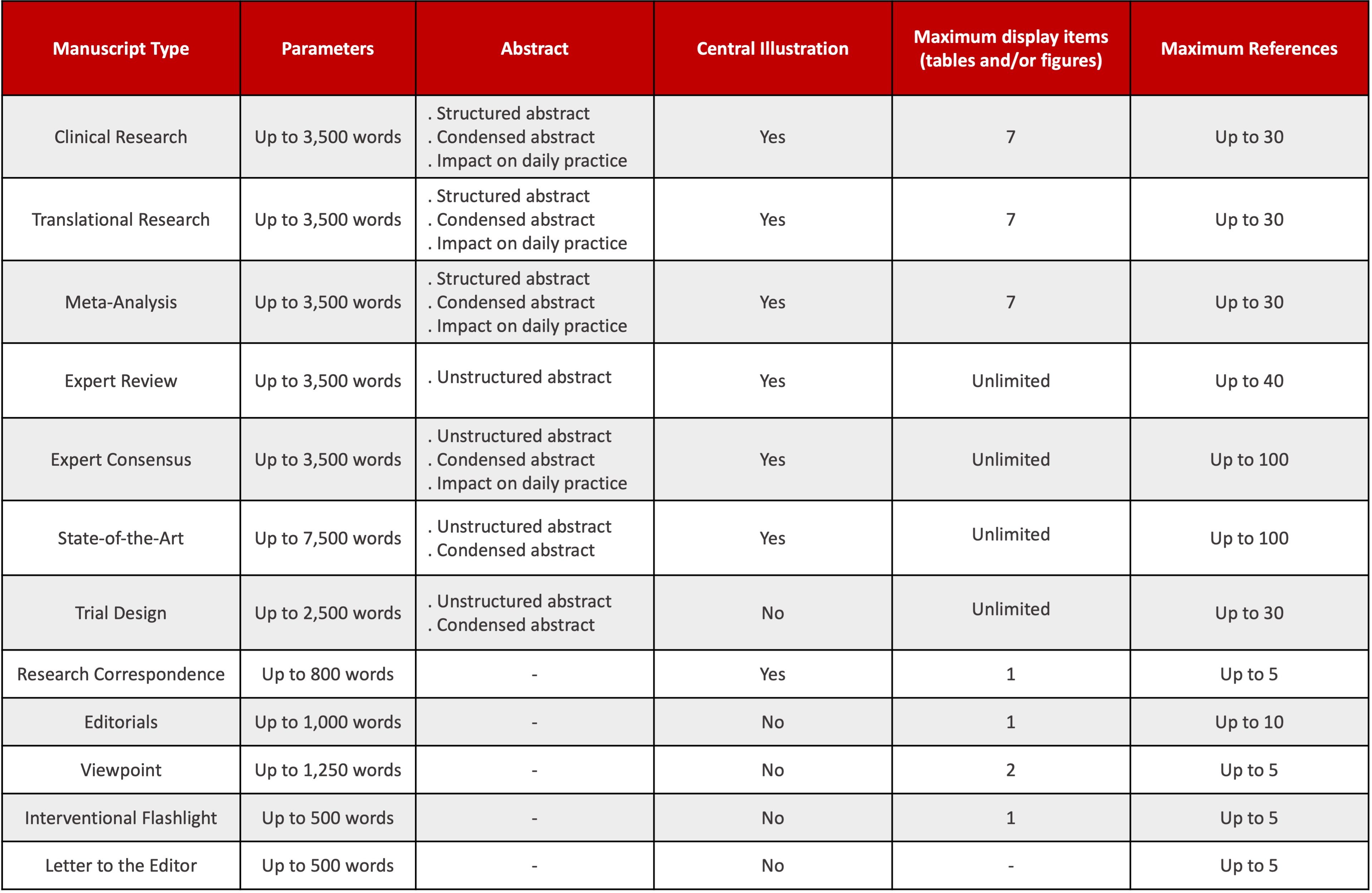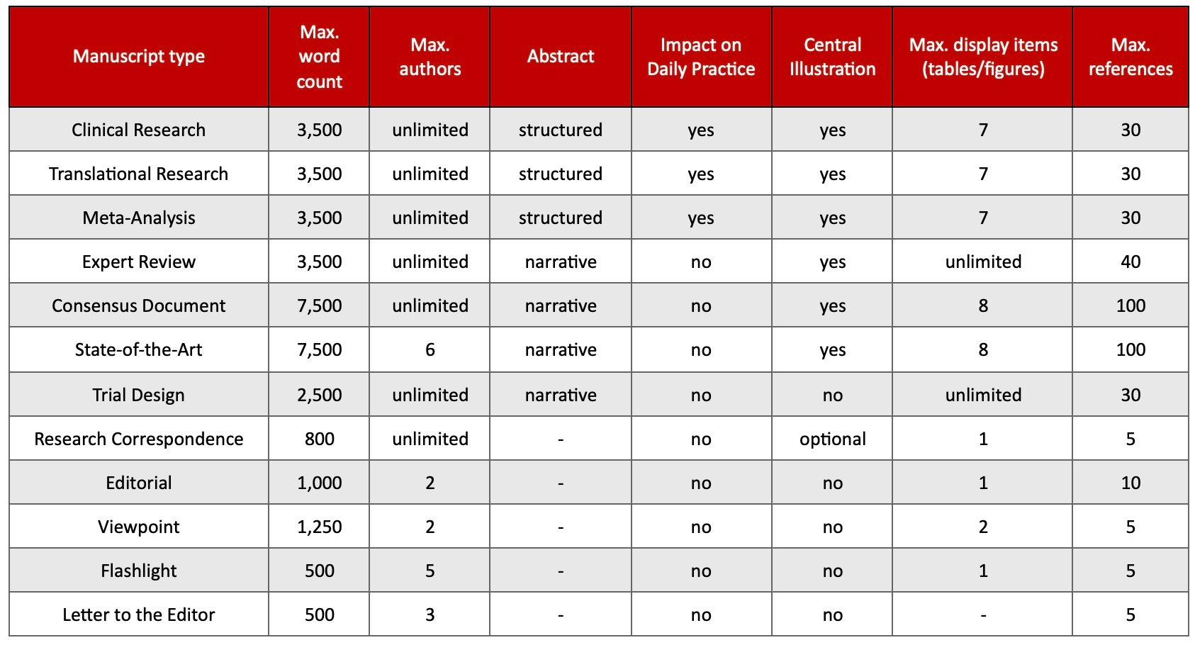 All word count limits are intended for the text from the introduction to the conclusion, and they exclude abstract, figure legends, and table notes. For any text exceeding the word limit, upload of supplementary material is permitted. For some categories, a Central Illustration and/or a panel named “Impact on daily practice” is required.